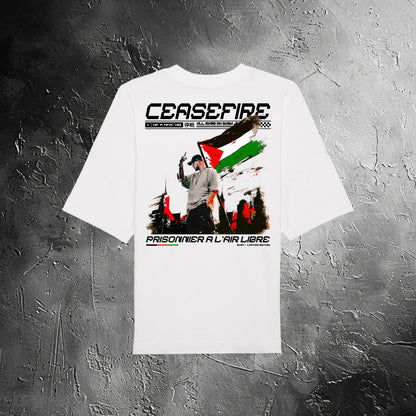 "Ceasefire" pays tribute to Tif and his powerful track supporting the Palestinian cause. This design reflects the raw emotion and resistance captured in his music, embodying a call for peace and justice.